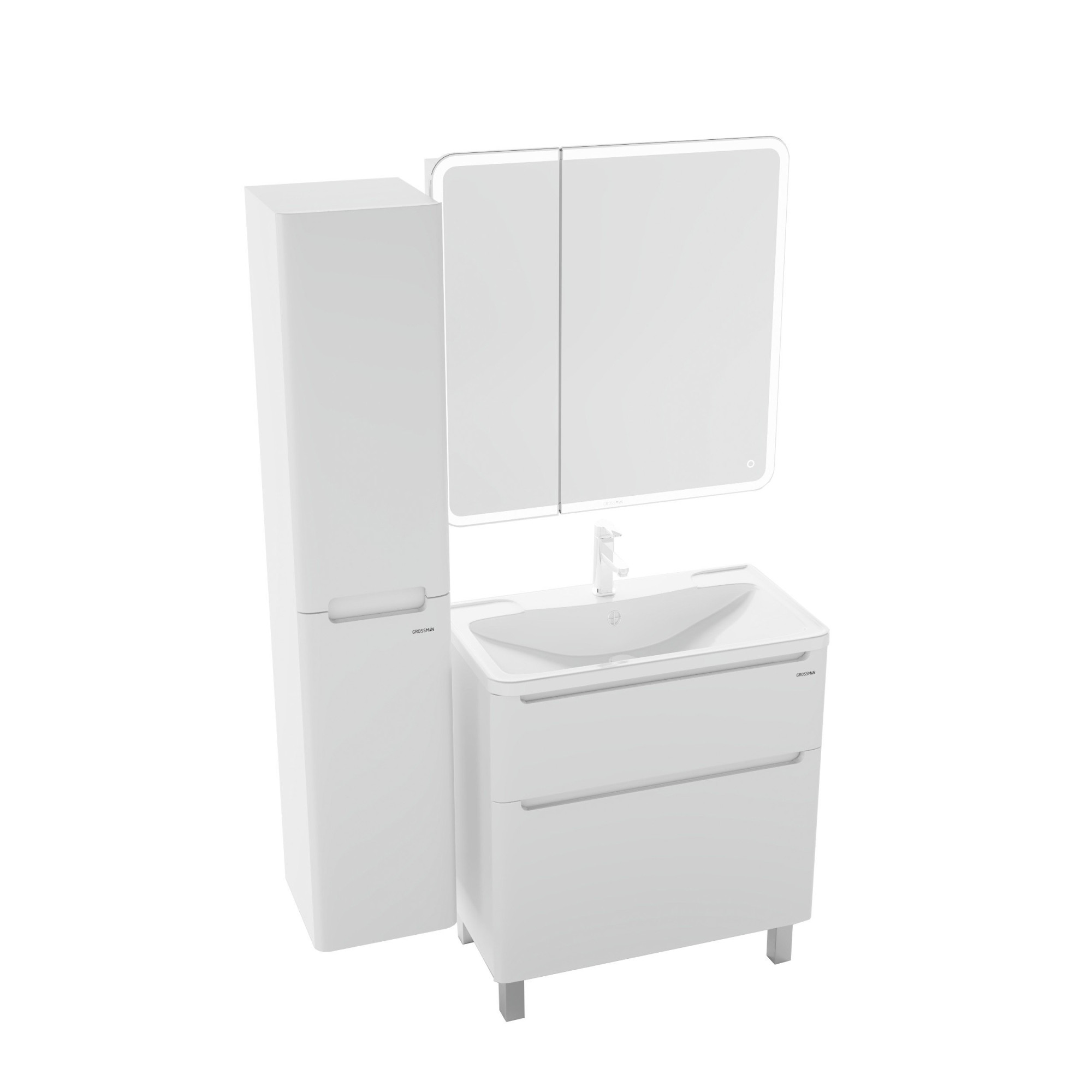Зеркальная дверь с LED подсветкой и сенсорным выключателем создаст уют и дополнительное освещение, а пространство за распашной правой зеркальной дверцей, оснащенной механизмом плавного закрывания, станет удобным местом для хранения принадлежностей.